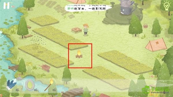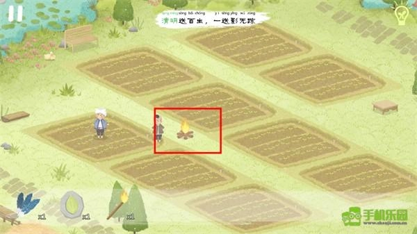 右下田地里的小朋友得生火驱虫,你点击他手中的棍子,再拖到对岸的火焰上把火把点燃。