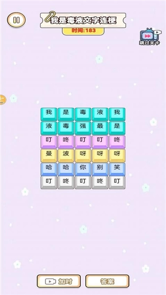 操作界面设计简洁,玩家只需在屏幕上滑动即可连接文字;若想重新挑战当前关卡,点击重开按钮即可;界面上方会实时显示剩余时间和当前得分情况。