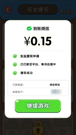 当你闯过特定关卡时,就能直接领取提现奖励,比如通过第三关就可以直接提现0.15元。