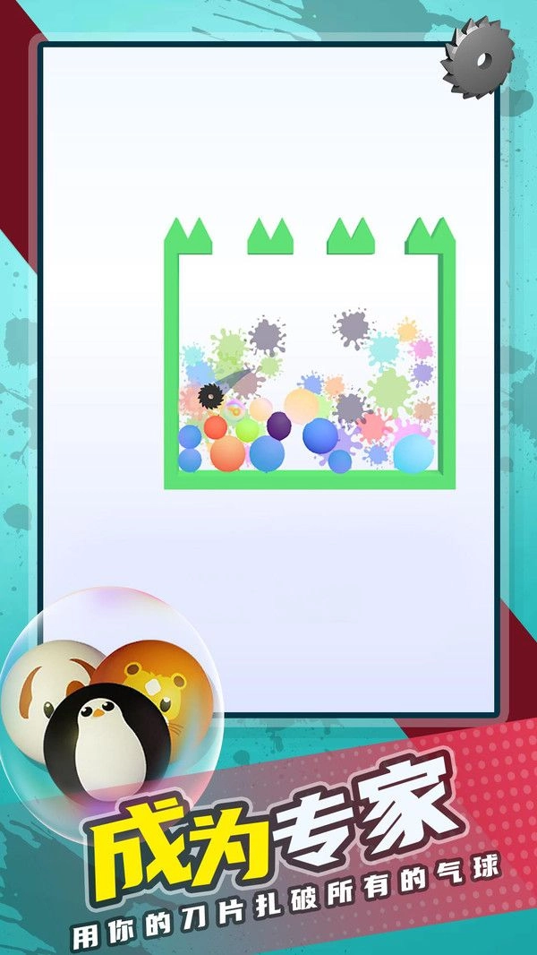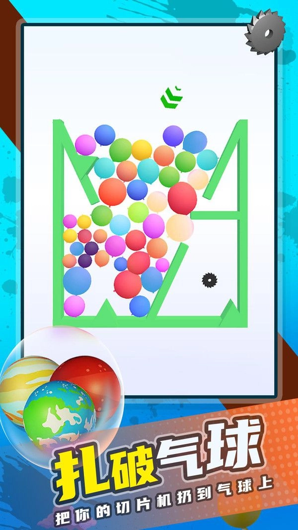 在这个游戏里会出现大量气球,你得借助关卡里的切割机把它们击碎。