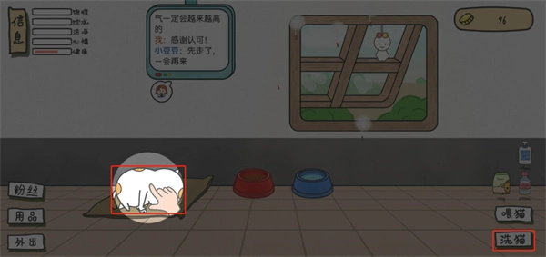 8、当左上角小猫的健康度显示为异常状态时,点击“洗猫”图标就能启动洗漱功能,助力小猫恢复清洁与健康。