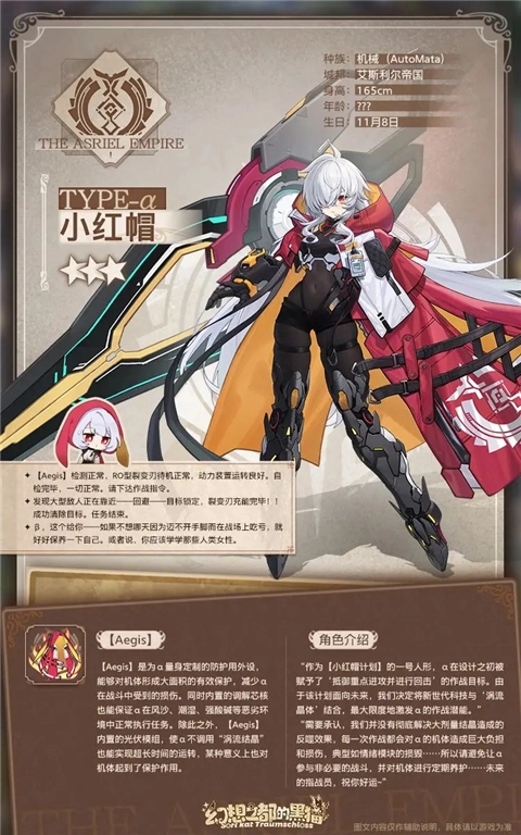 作为【小红帽计划】的首个人形,α在设计之初就被设定了“抵御重点进攻并实施反击”的作战目标。鉴于该计划着眼于未来,我们决定把新世代科技与“涡流晶体”相融合,以最大程度地挖掘α的作战潜能。