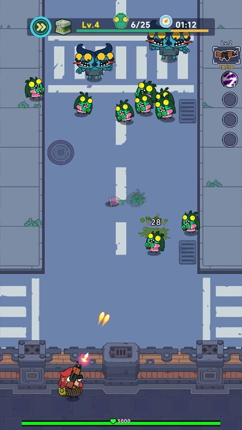 4、游戏融入了割草玩法元素,玩家可操控角色在成群的僵尸中奋力开辟出一条通路,尽情体验酣畅淋漓、无休无止的战斗乐趣。