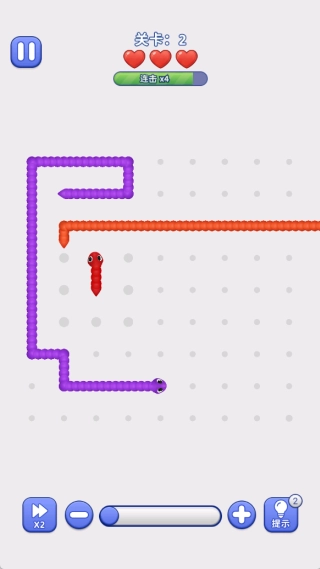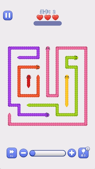 1、消除关卡内所有小蛇箭头,操控萌蛇触碰对应箭头完成清除,每消除一批箭头就向通关迈进一步,体验畅快的消除快感。