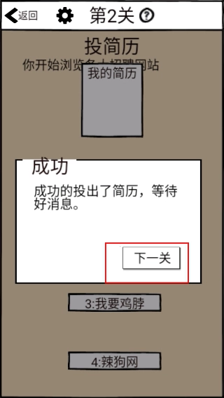4、投简历成功后出现提示框,点击框内的【下一关】按钮,即可进入后续关卡继续挑战。