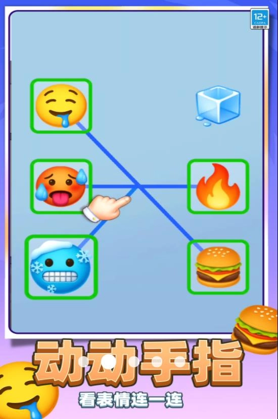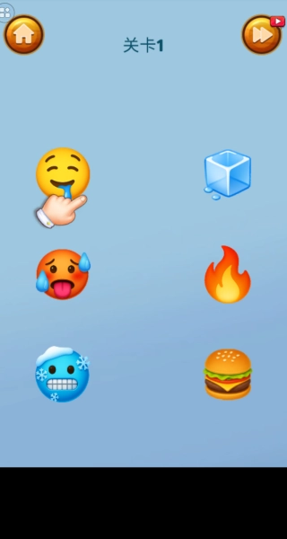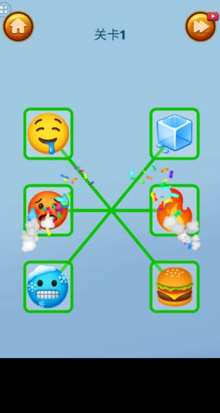 2、观察表情与物品的关联,按照表情需求将左侧表情与右侧物品对应连接,完成关卡1的配对任务。