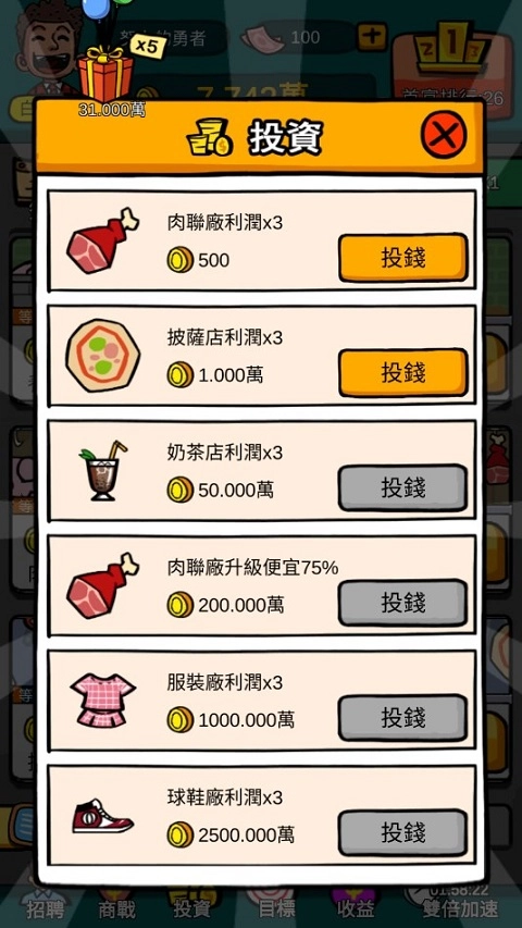 游戏里设置了不少有意思的投资事件,借助这些事件,你能积累更多财富,体验经营带来的乐趣。