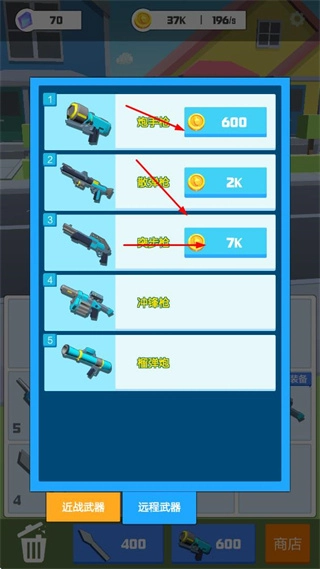 在商店里能买到各式各样的远程武器,随着游戏的推进还会解锁更高级的枪械,花费相应的金币就能提升战斗力。