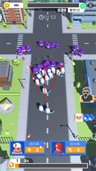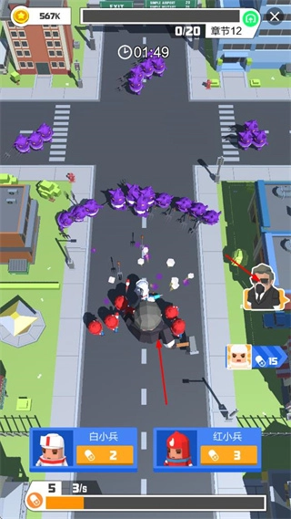 在城市街道的场景里,指挥白小兵、红小兵和紫色敌人展开战斗,要留意士兵的数量、战斗时长以及章节推进情况,通过合理安排士兵来战胜敌人。