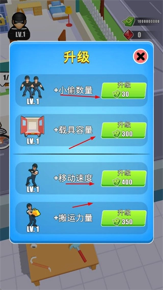 在升级界面,你可以消耗资源来提升小偷数量、载具容量、移动速度等属性,从而增强盗窃和搬运的效率。