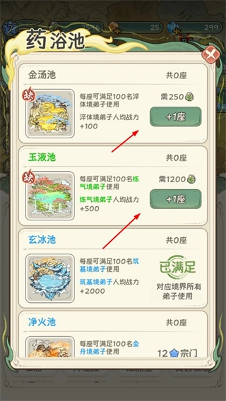 在药浴池界面建造供不同境界弟子使用的药池,消耗资源来增加药池数量,以此提升对应境界弟子的人均战力。