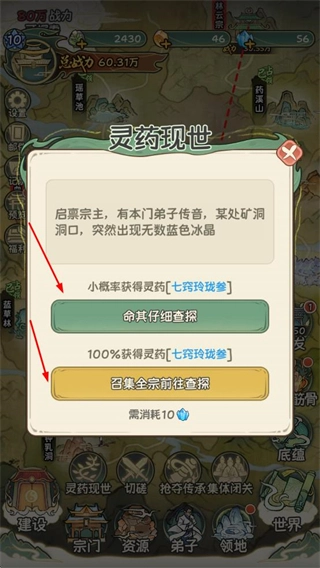 关于灵药现世这件事,你可以下令让专人仔细探查情况,也可以召集全宗弟子一同前往探寻,从而获取灵药来帮助弟子们提升修为。
