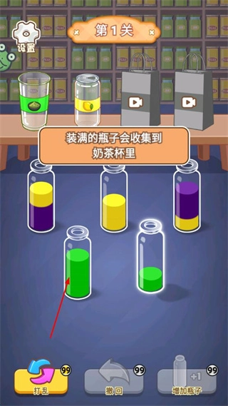点击那只装有绿色液体的瓶子,瓶内的绿色液体便会被收集到相应的奶茶杯中。