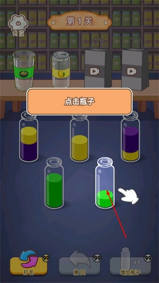 点击盛有绿色液体的瓶子,把绿色液体倒进空瓶,让空瓶里的绿色液体慢慢填满。