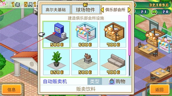 在建造环节,我们能够搭建高尔夫球场的基础设施、球场相关物件以及俱乐部会所的内部设施,点击自动贩卖机即可完成搭建操作。