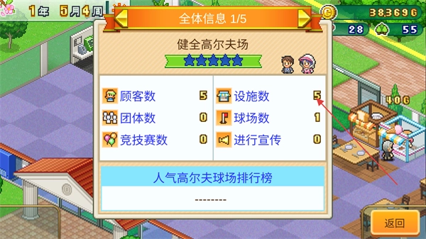 在菜单栏里点击“信息”选项,就能查看高尔夫球场的详细情况,了解到当前的顾客人数、设施数量等相关信息。