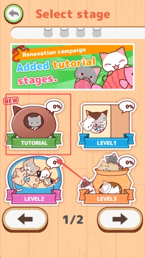 请在「TUTORIAL」和「LEVEL1」中选择其一,注意看操作示范:点击猫咪就能抓住它。