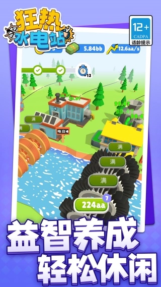 《狂热水电站》是一款极具趣味性的经营模拟休闲游戏。在游戏中,玩家将以水电工程师的身份开启挑战,从搭建简易水车开始,一步步构建起庞大的发电网络。通过合理规划河道布局、升级各类发电设施,玩家能从最初的传统水车逐步解锁到现代化的涡轮机组。游戏借助真实的水流模拟系统,让玩家为从村庄到城市的不同区域提供稳定可靠的电力支持。