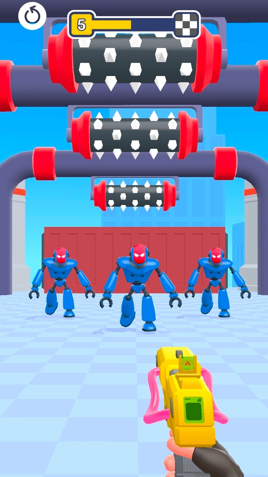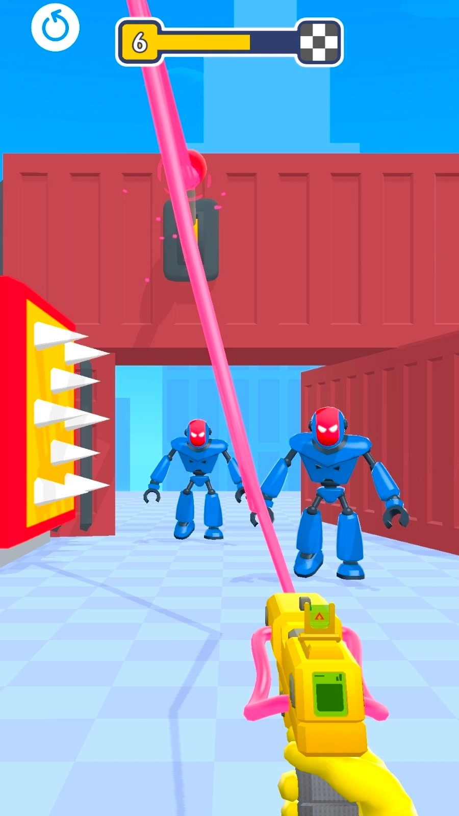 1、留意场景里的各种元素,优先把机器人和高伤害机关(比如带刺滚筒这类)连接起来,这样机器人靠近时就能触发机关,实现快速清理敌人的效果。