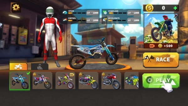 1.玩家可以在关卡开启前挑选不同的摩托车,还能给角色更换各式各样的造型。