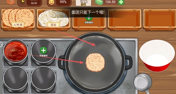 3、制作时需先选取面团,按照“每次只能投放一个面团”的规则操作,把面团放入锅中后,再搭配对应的酱料来完成制作。