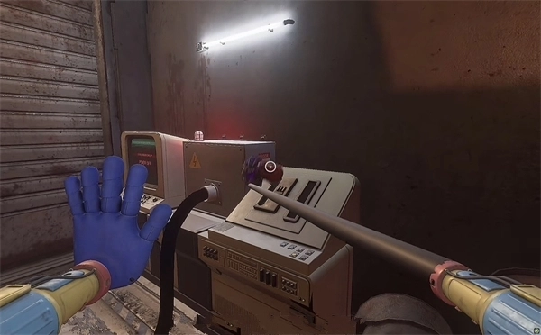 9、照明恢复后,定位角落的故障终端机。按下主机箱侧键后,需沿地面浮现的蓝色电流轨迹移动,直至抵达终端机背面接口。