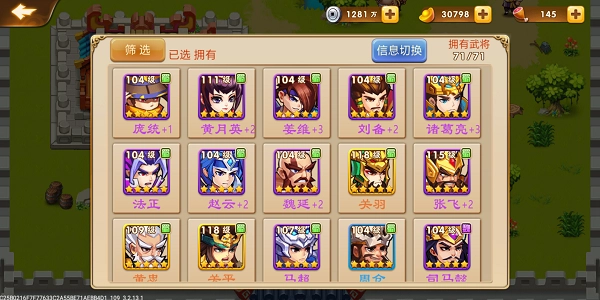 到目前为止,这款游戏里一共有71位武将,具体来看,紫色武将有48名,蓝色武将14名,绿色武将则是9名。在我看来,这些武将可以分成两大类:一类是侧重智力的军师,另一类是侧重武力的将军,所以每个玩家都得搭配1名军师和4名将军才行。
