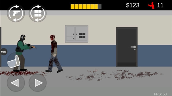分别是往左走和往右走,左上角分别是换枪和换子弹,右下角的是一个保命技能,僵尸如果靠近你你可以用踢腿运动将它踢倒或者后退,游戏中最多可以一次踢到两个僵尸,运用好该技能你将会轻松许多,顺带提一下,游戏中你用枪射击僵尸腿一次会得到2块钱,射击僵尸身体一次会得到5块钱,射击僵尸头部一次会得到10块钱,好像没什么不对的。